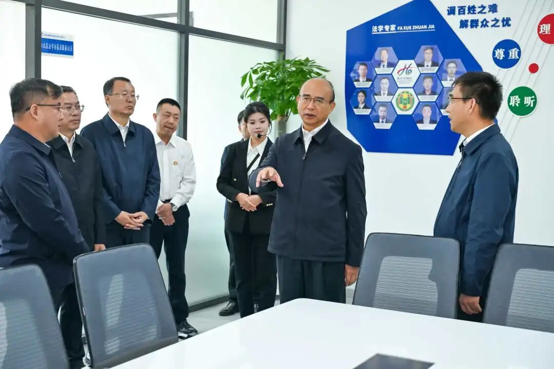 在哈尔滨新区综治中心,许勤了解引导受理、多元化解、指挥调度等功能区和公共法律服务中心运行情况