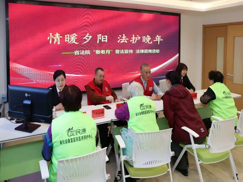 金秋时节,丹桂飘香,正值全国第16个“敬老月”之际,省法院离退处联合刑二庭、立案二庭,组建了一支由青年法官与资深退休法官共同参与的“法治宣讲团”,于10月23日上午在省社会康复医院,举办了一场以“情暖夕阳 法护晚年”为主题的普法宣传活动。活动由省法院离退休干部党总支书记王铁男主持,通过“专业讲解+法律咨询”的双轨服务模式,为老年群体提供精准、高效的法律服务。