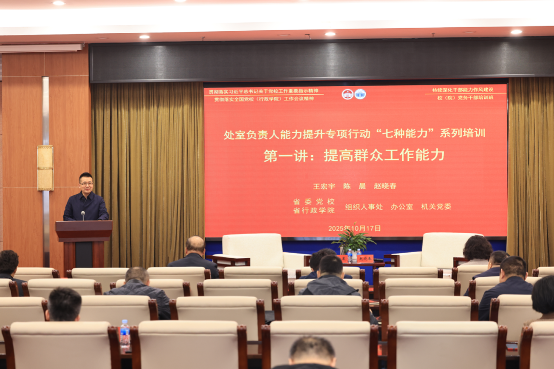 为深入学习贯彻习近平总书记关于党校工作的重要论述、重要指示精神和全国党校(行政学院)工作会议精神,持续深化干部能力作风建设,提升党员干部履职能力,10月17日,校(院)以“学理论·强党性·转作风·提能力”为主题,持续推进“处室负责人能力提升专项行动”,聚焦习近平总书记要求领导干部必须具备的“七种能力”开展系列专题培训。系列专题培训的第一讲以《提高群众工作能力》为主题,并同步作为年度校(院)党务干部培训班的开班第一讲。副处级以上党员干部及各支部党务工作者参加培训学习。