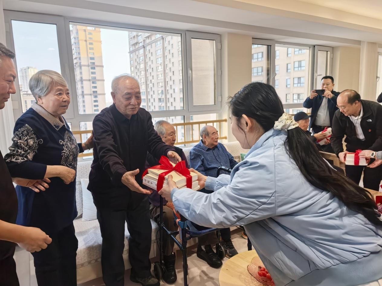 慰问现场温情洋溢,党员干部与老同志们促膝而坐,拉家常、问冷暖、话初心,关切地询问他们的健康与生活状况,并认真倾听他们的心声与期盼。老同志们也深情回顾工作岁月,向年轻一代分享宝贵经验与人生感悟,青年干部则主动帮助老同志解决智能手机使用等日常难题。一场跨越岁月的对话,在暖心交流中悄然流淌。临别之际,前去慰问的党员干部向老同志们送上了精心准备的鲜花慰问品和《习近平谈治国理政》第五卷等相关书籍,传递了组织的深切关怀。