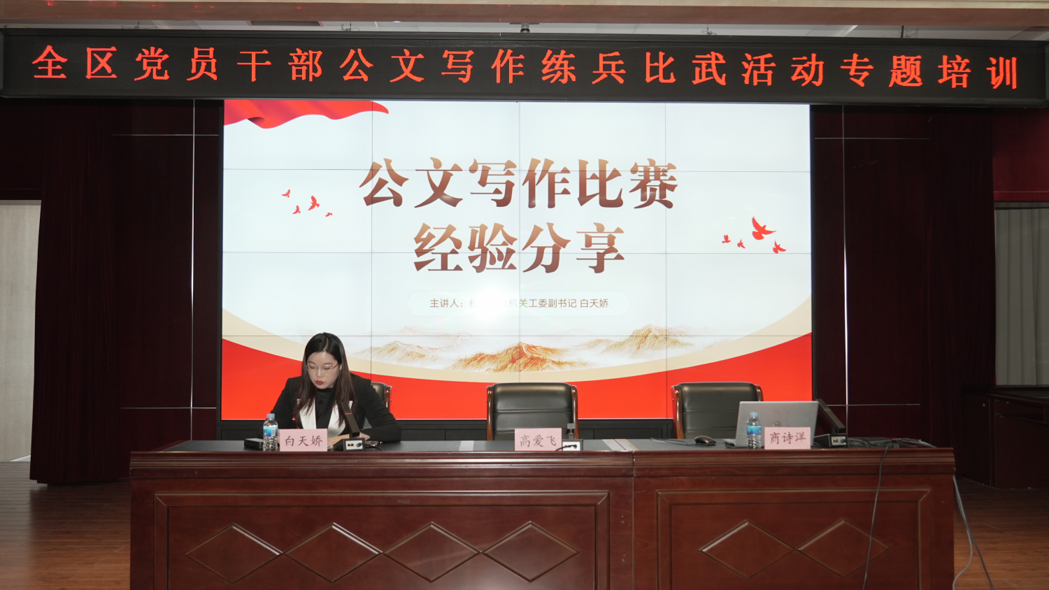 区直机关工委副书记白天娇结合全市公文写作比赛实战经验,从立意谋篇、材料组织、语言表达等方面,分享了公文写作的实用技巧与规范要求,具有很强的指导性和操作性,为参训人员在比武练兵中提升实战能力打下坚实基础。