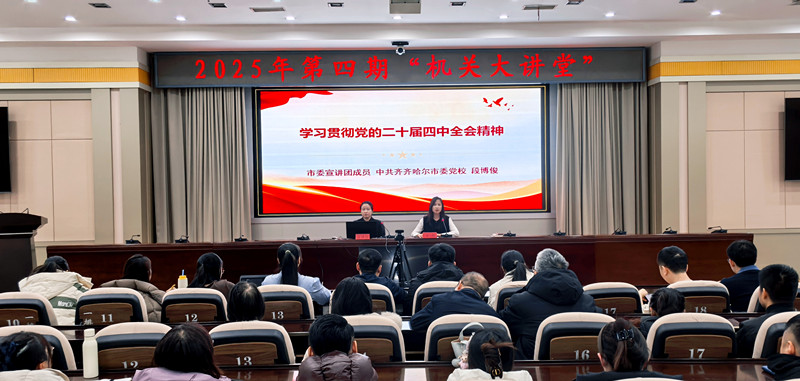 为进一步推动学习宣传贯彻党的二十届四中全会精神走深走实,切实以高质量机关党建引领保障高质量发展,12月11日,齐齐哈尔市直机关工委举办2025年第四期“机关大讲堂”。市委党校(市行政学院)经济学教研部副教授段博俊应邀作专题宣讲。市直机关120余名党员干部现场聆听,1000余名党员干部通过“鹤城红话筒”线上同步参与学习。