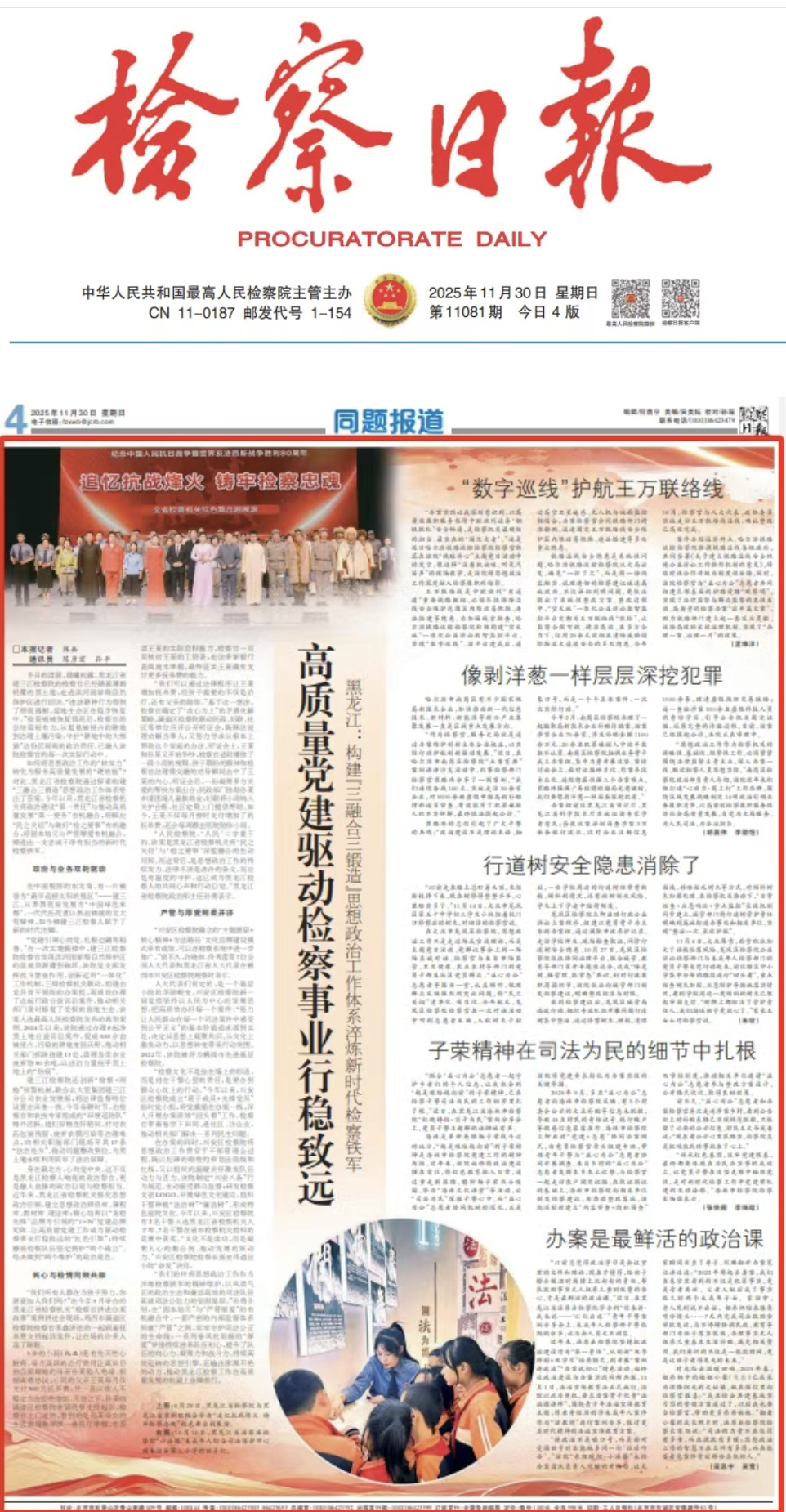 2025年11月30日在《检察日报》头版发表文章《构建三融合三锻造思想政治工作体系淬炼新时代检察铁军 高质量党建驱动检察事业行稳致远》