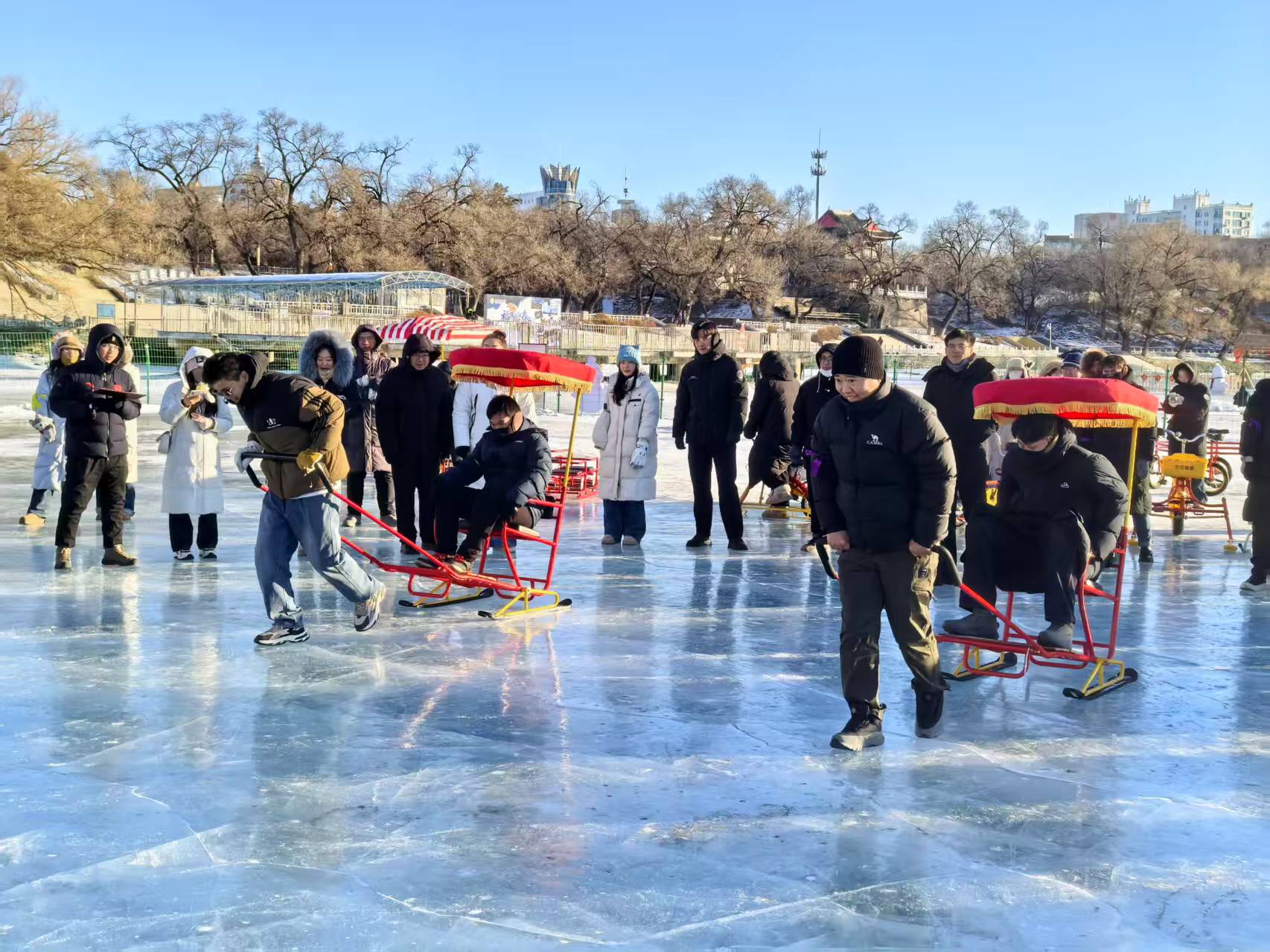 活动中,团员青年们了解了齐齐哈尔冰雪经济的整体布局、冰雪项目的发展现状以及龙沙公园时光走廊冰雪乐园的规划理念、建设运营模式及特色娱乐项目。随着了解的深入,一幅“冰雪+文旅”深度融合的发展画卷徐徐展开,团员青年们直观感受着冰雪经济蓬勃向上的强劲势头,对冰雪资源转化为发展胜势的路径有了更深刻的认识与思考。随后,团员青年们开展冰雪拓展,在趣味冰壶、冰坑挑战、雪地爬犁及冰上自行车四项竞赛中展开角逐。团员青年还进行了交流研讨,结合参观体验与岗位实际,聚焦“冰雪+文旅”融合发展、冰雪产品创新升级、冰雪专业人才培养、冰雪市场推广拓展等关键议题各抒己见、建言献策。