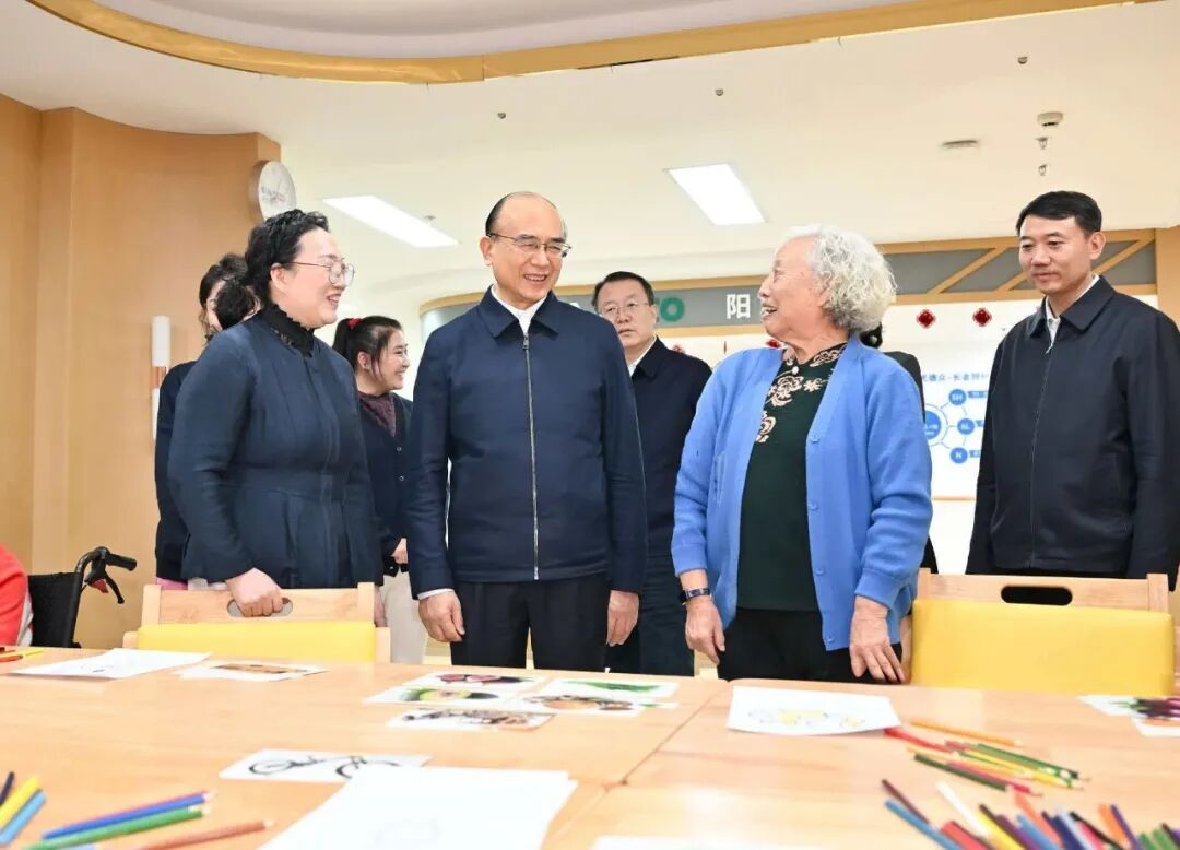 在阳光德众长者照护中心,许勤走进活动室,询问老人们的身体状况、饮食起居等情况,祝他们健康长寿、新春快乐。