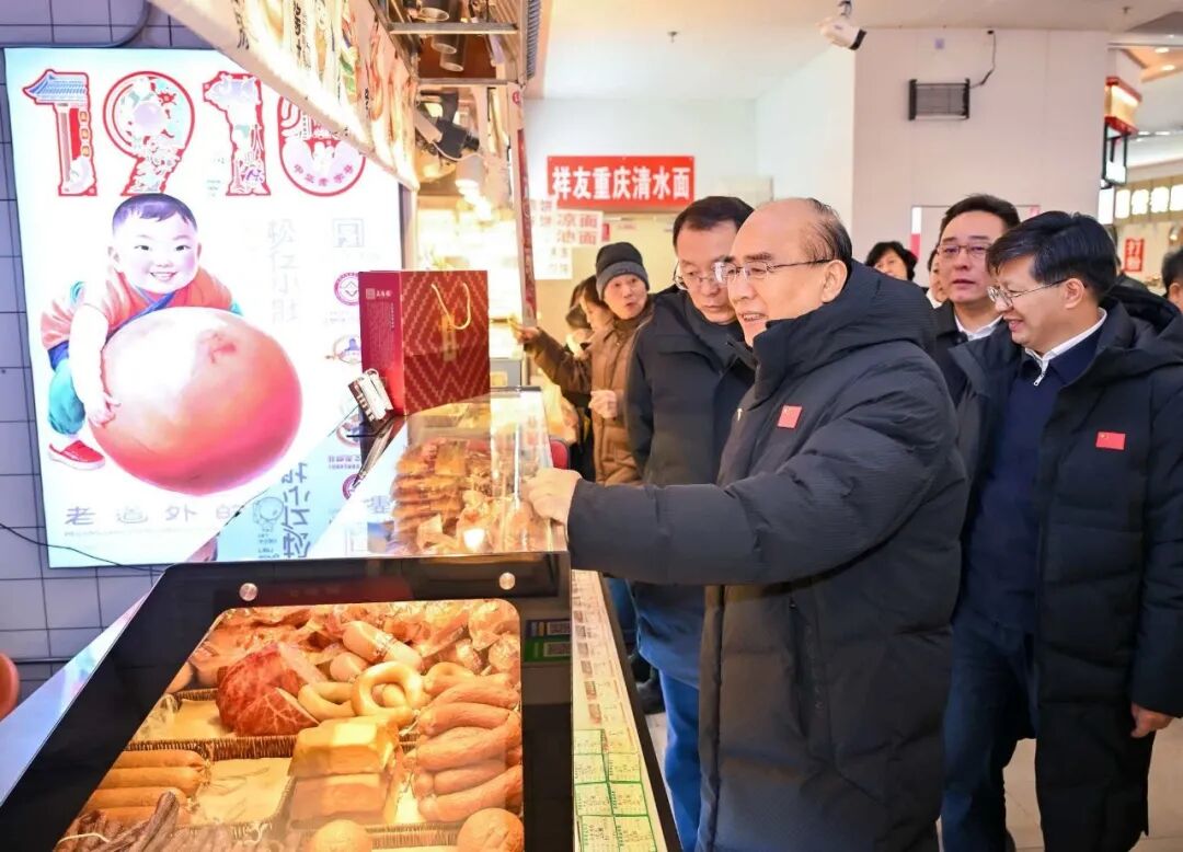 京东七鲜美食市场是人和集团和京东集团联合推出的新型餐饮副食商超。春节临近,市场年货琳琅满目,人流熙熙攘攘,洋溢着喜气洋洋的浓浓年味。许勤驻足食品摊位和餐饮商铺,与商户交流商品品类、销售情况,叮嘱他们注意用火用气安全。许勤说,市场保供是事关民生的大事,要备足货源、丰富品类,加强市场监管,保持物价稳定,守牢食品安全底线,加强消防等安全管理,营造安全舒心的消费环境。看到正在忙碌的快递小哥,许勤询问每天跑多少单、收入怎么样、过年回不回家,向他们致以节日问候并嘱咐他们注意交通安全、劳逸结合,把生活过得更好。