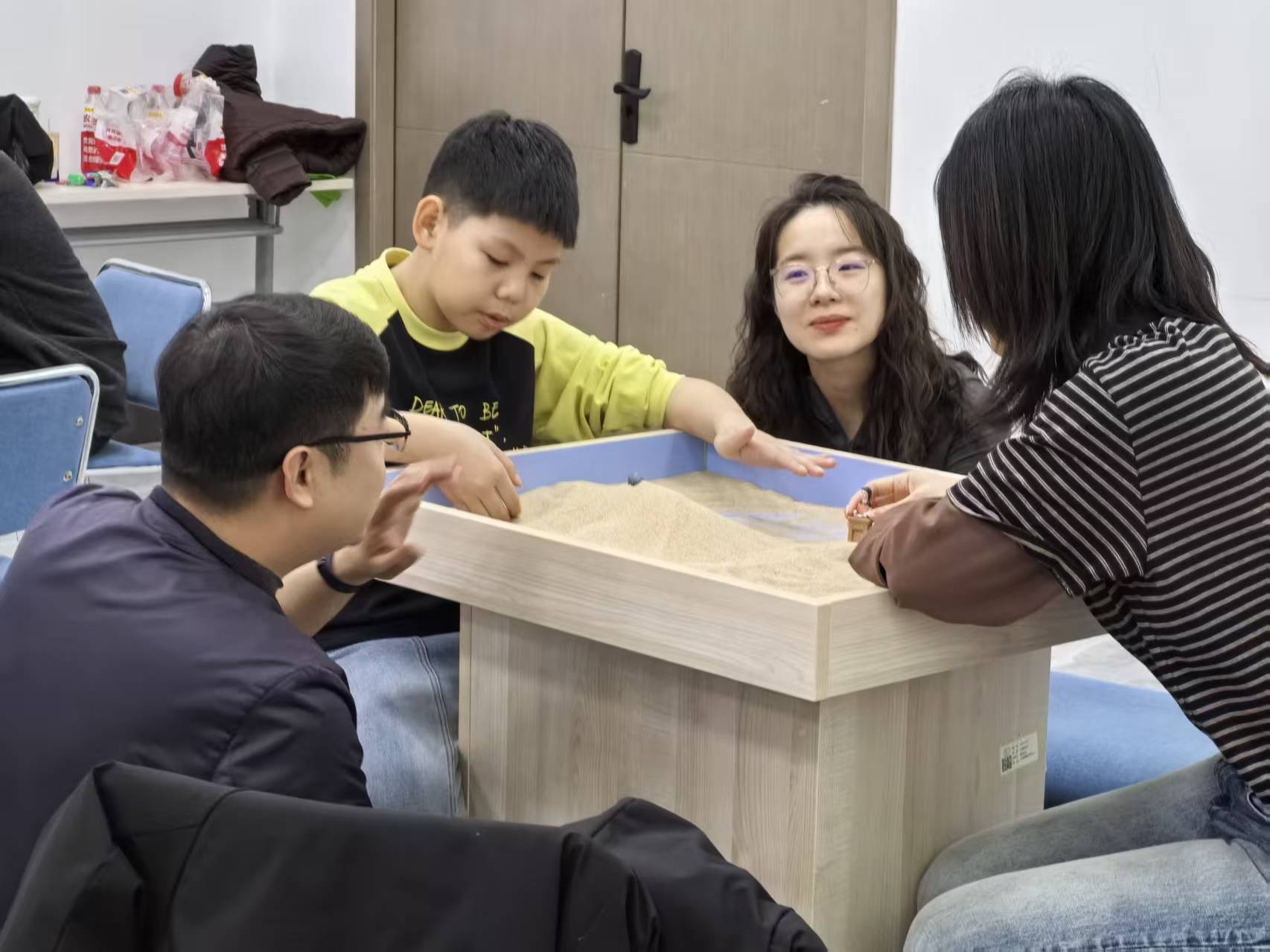 活动中,孩子们借助沙具尽情挥洒天马行空的想象,在自由创作中释放童真与活力;教职工则在沉浸式的沙盘搭建中舒缓工作压力,沉淀内心;研究生们在沙盘创作的过程中缓解学业焦虑,静心梳理思绪。