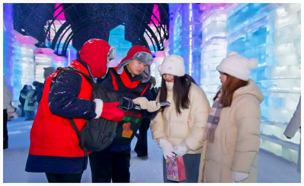 省电力公司青年干部在“梦幻冰雪季 因电更美丽”主题志愿服务活动中为外地游客提供手机充电服务