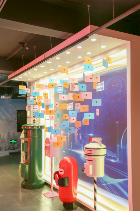 “写给未来的信”互动专区,配套邮筒和印有黑龙江标志性地名标识的明信片,邀请参观者写下参观后的感受、对故土的热爱等